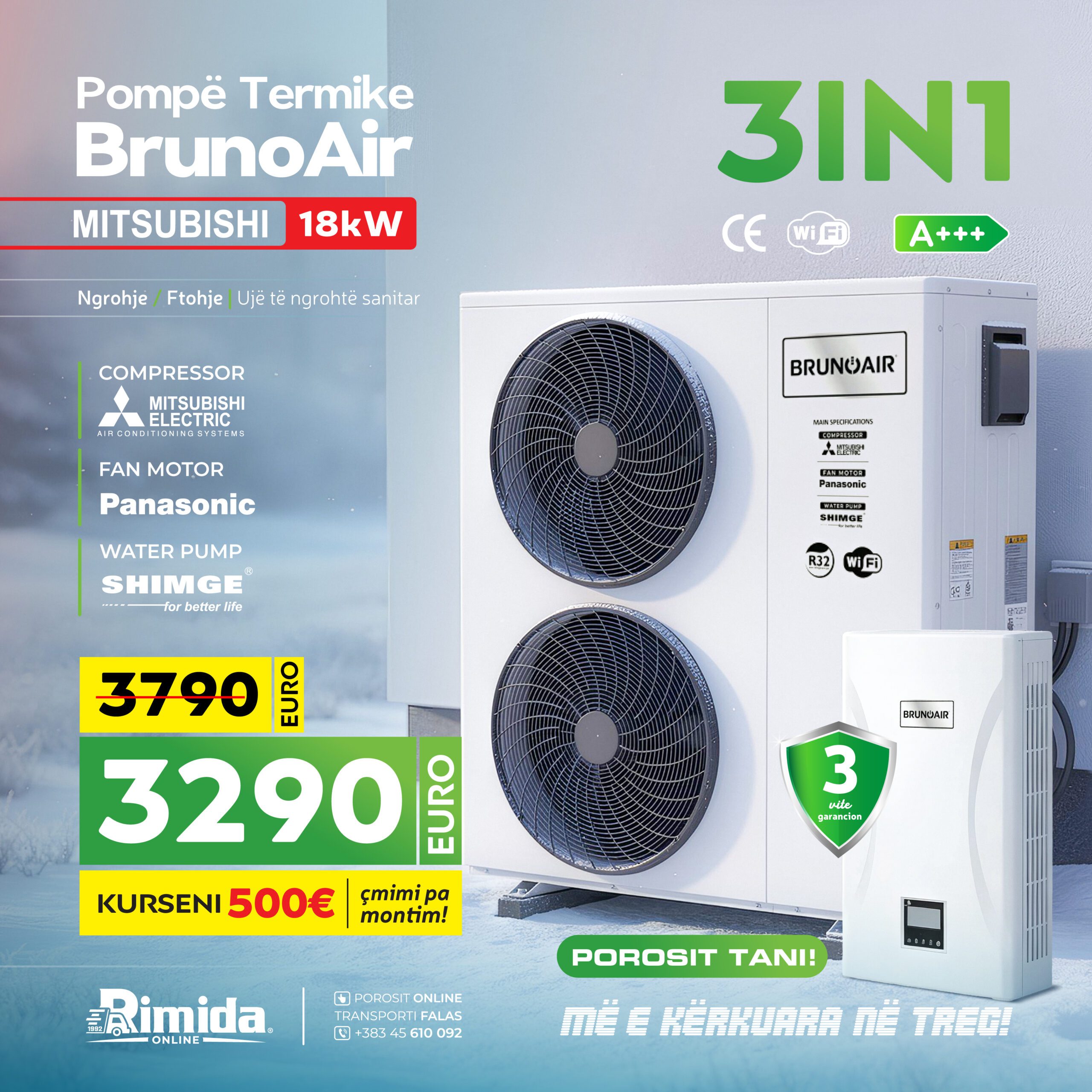 BrunoAir 3in1 Mitsubishi Kompresor është zgjidhje moderne dhe efikase për ngrohjen dhe ftohjen e ambienteve, si dhe duke iu siguruar ujë të ngohtë sanitar.