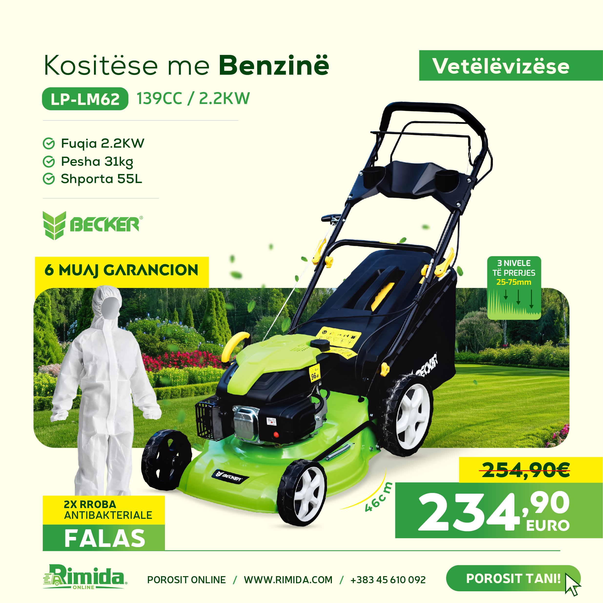 Kositësja Benzin Becker LP-LM62 është një vegël vetëlevizëse e fuqishme me Benzinë për prerjen e barit në kopshtin tuaj. Përmban një motor OHV me fuqi 139cc dhe 2.2 kW. Me gjërësi prerjeje prej 46 cm dhe  lartësi të prerjes të rregullueshme nga 25 mm deri në 75 mm, ajo ofron prerje të saktë dhe efikase për kopshtin tuaj.