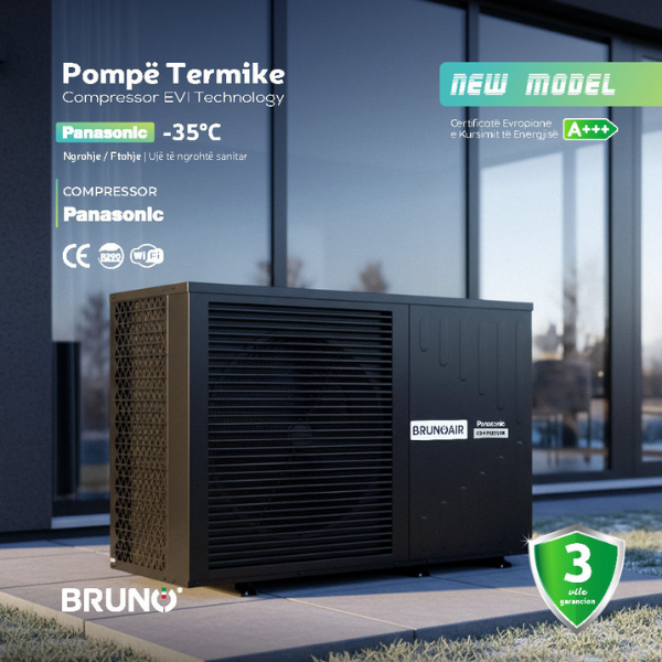 BrunoAir R290 Monoblock, është pompë termike e avancuar monoblock, e pajisur me kompresor PANASONIC dhe teknologjinë EVI (Enhanced Vapor Injec­on). EVI (Enhanced Vapor Injec­on) është teknologji e avancuar e kompresimit që injekton avull shtesë gjatë ciklit të punës së kompresorit, duke mundësuar ngrohje stabile edhe në temperatura deri në -35°C, rritje të efikasite­t COP në kushte të ftohta;  kapacitet më të madh ngrohjeje në dimër dhe jetëgjatësi më të madhe të kompresorit falë ngarkesës së balancuar të punës. Me gaz ekologjik R290, Wi - Fi të integruar, dhe dizajn elegant me një ven­lator të qetë, kjo pompë përfaqëson gjeneratën e re të pompave termike për shtëpitë moderne dhe bizneset që kërkojnë teknologji të pastër dhe performancë superiore.